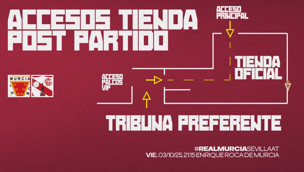 El Real Murcia informa a todos sus abonados y seguidores de la grada de Preferente que, tras la finalización del encuentro frente al Sevilla Atlético, podrán acceder directamente a la Tienda Oficial.