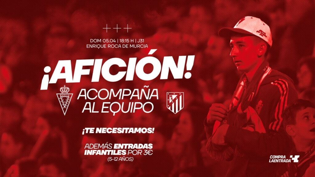 El Real Murcia CF hace un llamamiento a toda su afición para acompañar al equipo en un nuevo compromiso en el estadio Enrique Roca, en el encuentro frente al Atlético Madrileño.