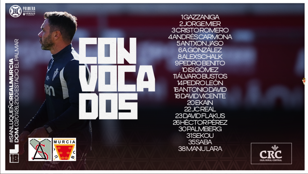 El entrenador del Real Murcia C.F., Adrián Colunga, ha dado a conocer la lista de convocados para el encuentro correspondiente a la jornada 18 de Primera Federación, que enfrentará a los granas al Atlético Sanluqueño este domingo a las 21:00 horas en el Estadio El Palmar de Sanlúcar de Barrameda.
