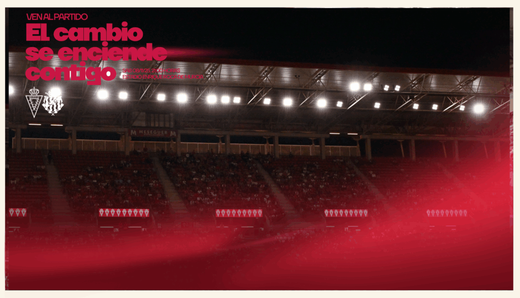 El Real Murcia te espera este sábado 8 de noviembre a las 21:00 horas en el Estadio Enrique Roca de Murcia para vivir una noche especial bajo el lema “El cambio se enciende contigo”.