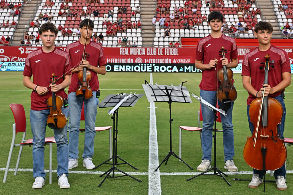 La previa del Trofeo Enrique Roca de Murcia estuvo marcada por un momento muy especial para todos los murcianistas. El Cuarteto Murisya fue el encargado de interpretar el Himno del Centenario en versión instrumental, llenando de solemnidad y emoción el ambiente en el estadio Enrique Roca de Murcia antes del inicio del encuentro ante el Elche CF.