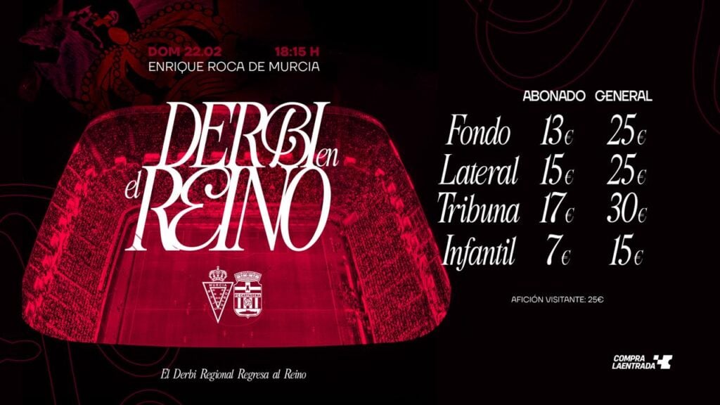 El Derbi Regional regresa al Reino. El Real Murcia CF pone a la venta las entradas para el encuentro ante el FC Cartagena, que se disputará el domingo 22 de febrero, a las 18:15 horas.