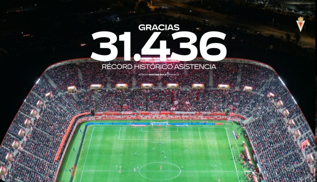 Este hito histórico refuerza el crecimiento social del club y consolida al Enrique Roca de Murcia como uno de los escenarios con mayor respaldo popular del fútbol español, convirtiéndose en el epicentro de una noche inolvidable para la ciudad y para el Real Murcia.