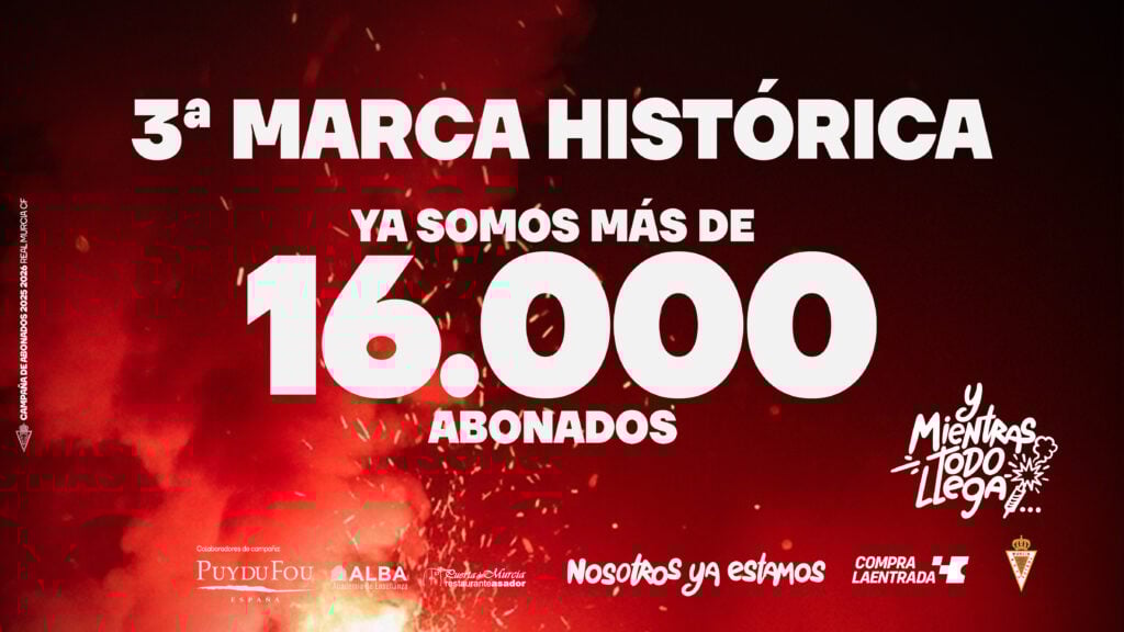 El Real Murcia continúa batiendo registros en la campaña de abonos 2025/26 bajo el lema “Mientras todo llega”. El club grana ha superado la cifra de 16.000 abonados, lo que supone alcanzar la tercera mejor marca histórica de su afición.