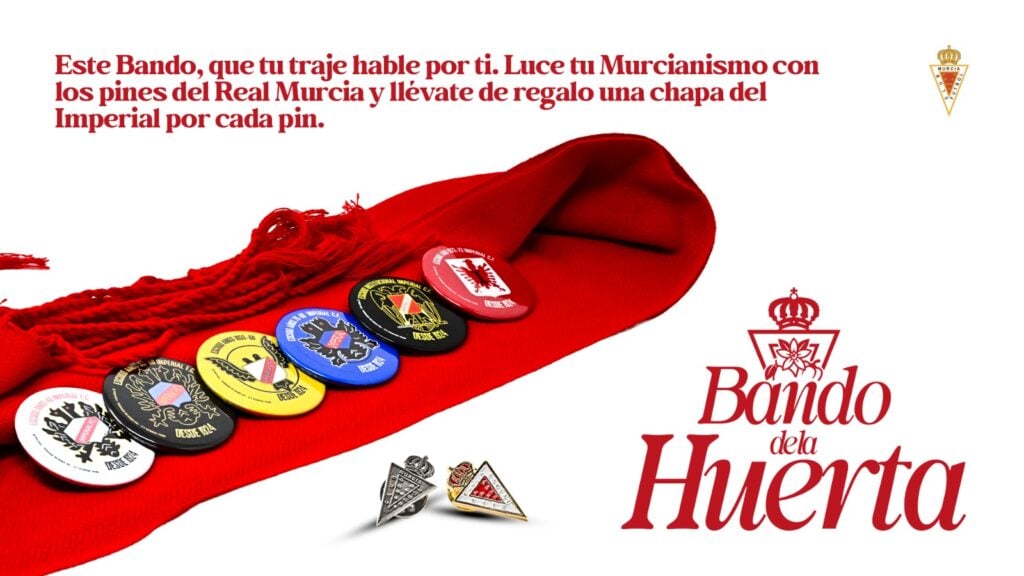 El Real Murcia estará presente un año más en el Bando de la Huerta, la gran fiesta que llena de color y tradición las calles de Murcia. Este año, los aficionados podrán lucir su Murcianismo con los pines oficiales del club y llevarse de regalo una chapa del Imperial por cada pin que adquieran.