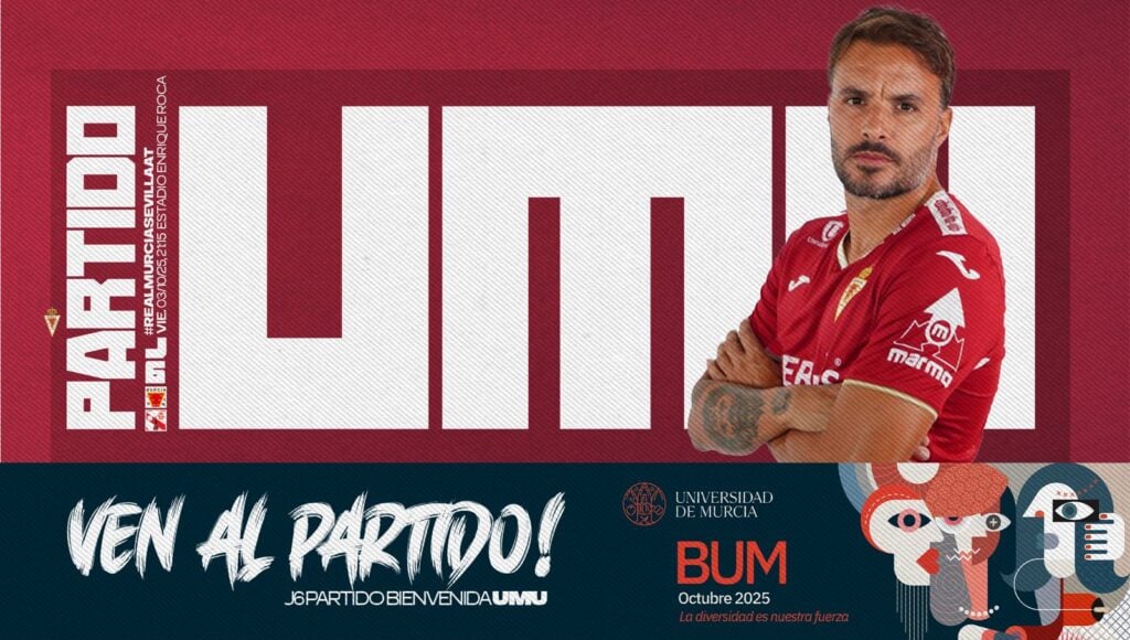 El encuentro que disputará el Real Murcia C.F. frente al Sevilla Atlético este viernes en el estadio Enrique Roca de Murcia será designado como el Partido Universitario, dentro de las acciones programadas en el marco del BUM (Bienvenida Universitaria) 2025.