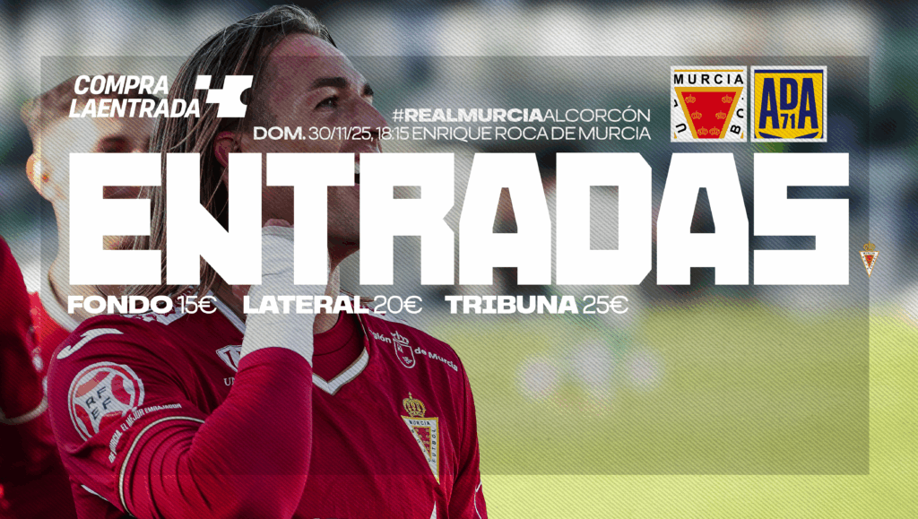 El Real Murcia pone a disposición de todos sus aficionados las entradas para el próximo partido en casa, que enfrentará al conjunto grana con la A.D. Alcorcón. El encuentro se disputará el domingo 30 de noviembre, a las 18:15 horas, en el Estadio Enrique Roca de Murcia.