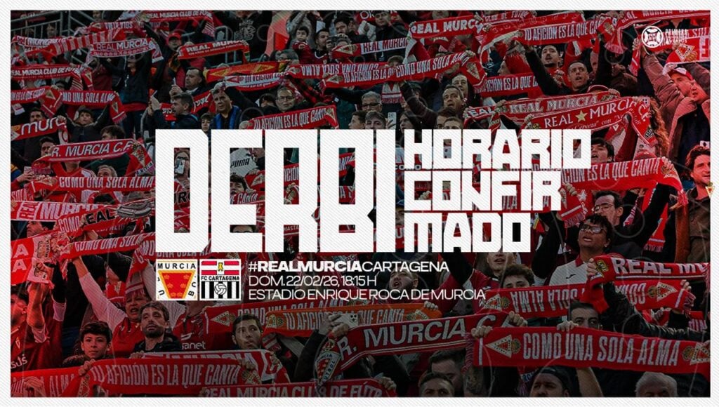 El Real Murcia CF ya conoce el horario del esperado derbi regional frente al FC Cartagena, correspondiente a la próxima jornada 25 de competición. El encuentro se disputará el domingo 22 de febrero, a las 18:15 horas, en el Estadio Enrique Roca de Murcia.
