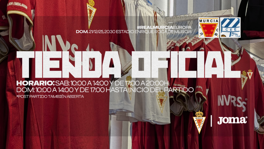 El Real Murcia informa a su afición sobre el horario de apertura de la Tienda Oficial del Estadio Enrique Roca de Murcia durante este fin de semana, con motivo del partido del domingo.