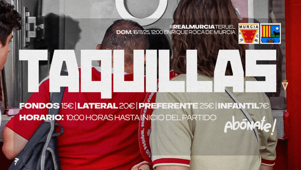 El Real Murcia C.F. informa de los horarios y precios de taquilla para el encuentro de este domingo entre el Real Murcia y el CD Teruel, que se disputará el 16 de noviembre a las 12:00 horas en el Estadio Enrique Roca de Murcia.