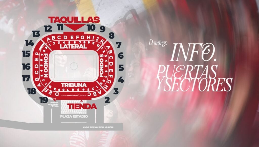 El Real Murcia CF informa a todos los aficionados sobre la distribución de puertas y sectores del estadio Enrique Roca de Murcia para el encuentro de este domingo.