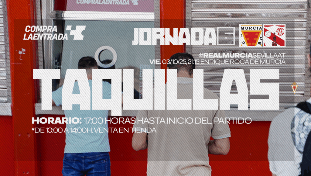 El Real Murcia recuerda a todos sus aficionados que mañana, viernes 3 de octubre, podrán adquirir sus entradas en las taquillas del estadio Enrique Roca de Murcia con motivo del encuentro ante el Sevilla Atlético, correspondiente a la Jornada 6 de Primera Federación.