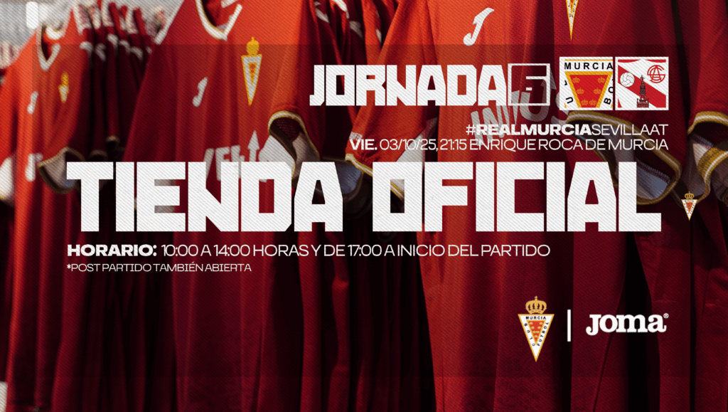 Con motivo del encuentro de esta noche, viernes 3 de octubre, entre el Real Murcia y el Sevilla Atlético en el estadio Enrique Roca de Murcia, la Tienda Oficial del club contará con un horario ampliado para facilitar el acceso a todos los aficionados.