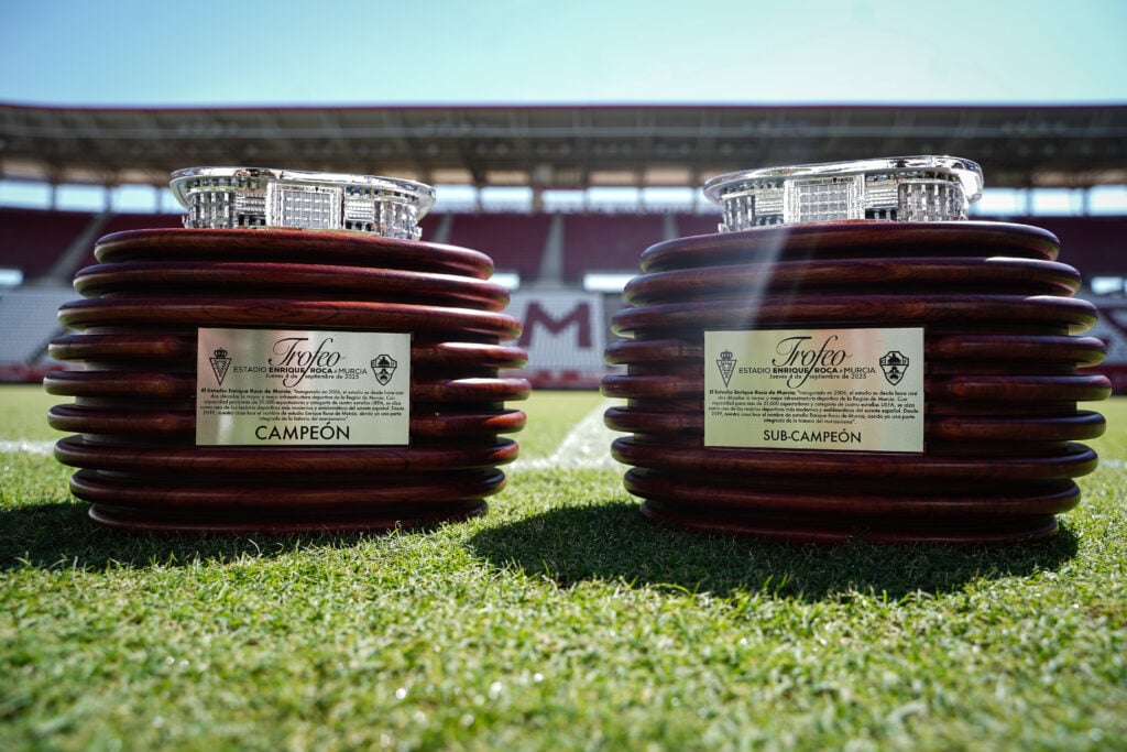 El estadio Enrique Roca de Murcia ya luce preparado para una jornada muy especial. Los trofeos que coronarán esta noche al campeón del Trofeo Enrique Roca de Murcia ya están sobre el césped, a la espera del gran duelo entre el Real Murcia y el Elche CF, que además servirá como presentación oficial de la plantilla grana para la temporada 2025/26.