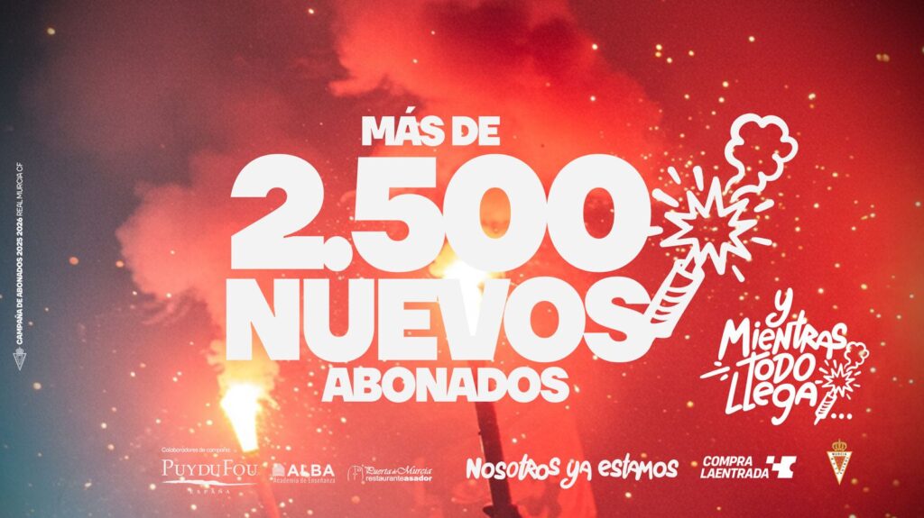 La campaña de abonos del Real Murcia continúa batiendo cifras y confirmando el gran respaldo social que vive el club. En lo que va de temporada, más de 2.500 abonados son nuevas altas, lo que refleja el crecimiento y la capacidad de atracción que genera el murcianismo.