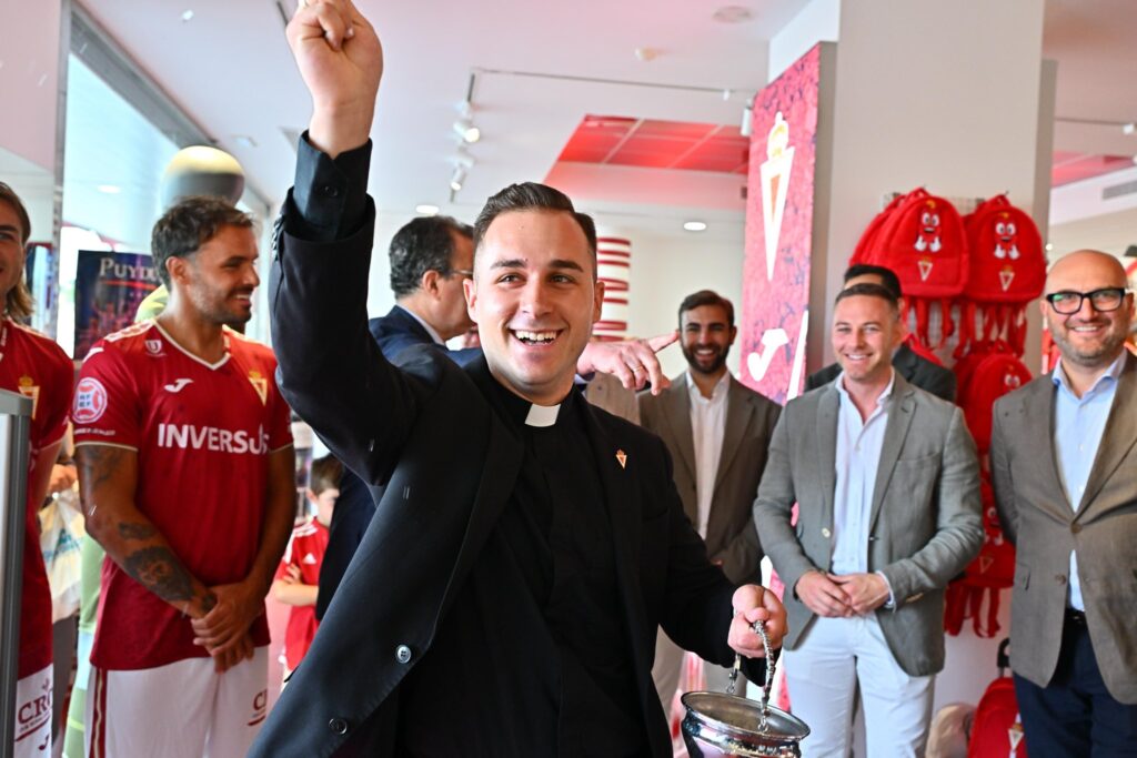 El Real Murcia sigue dando pasos en su crecimiento institucional y social. Este miércoles, el sacerdote Miguel Tovar (@TovarPater), conocido por ser el más joven de la Región de Murcia y declarado murcianista, fue el encargado de bendecir la ampliación y reforma total de la tienda oficial del club en el estadio Enrique Roca de Murcia.