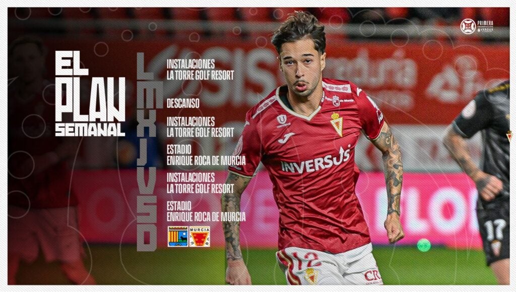 El Real Murcia ha definido su plan semanal de entrenamientos de cara a la preparación del próximo compromiso liguero, combinando sesiones en distintas instalaciones y una jornada de descanso para la plantilla.