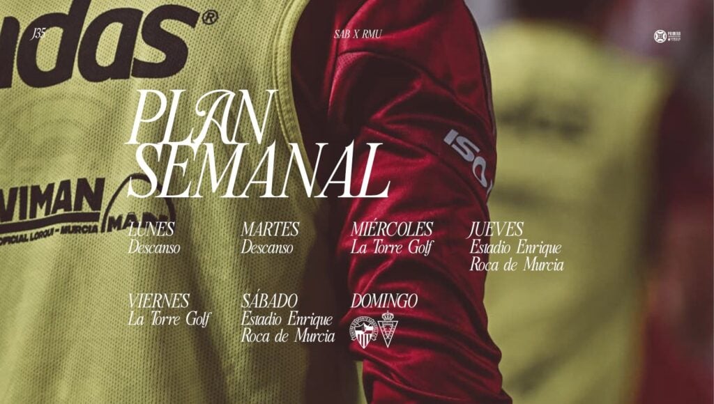 A partir del miércoles, el equipo volverá al trabajo con una sesión programada en La Torre Golf. El jueves, los de Curro Torres se ejercitarán en el Estadio Enrique Roca de Murcia, mientras que el viernes regresarán a La Torre Golf para continuar preparando el duelo.