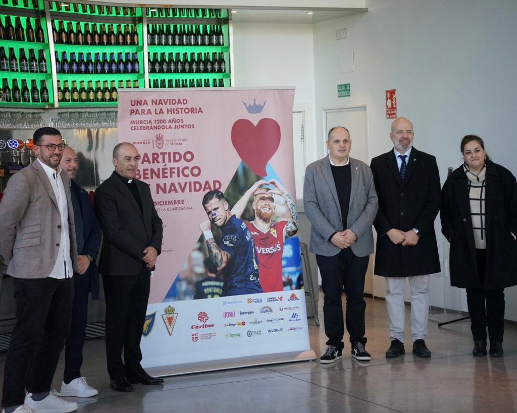El Partido Benéfico de Navidad UCAM Murcia – Real Murcia, a favor de Cáritas Región de Murcia, fue presentado este martes en un acto celebrado en la sala de catas de Estrella de Levante, con la colaboración del Ayuntamiento de Murcia.