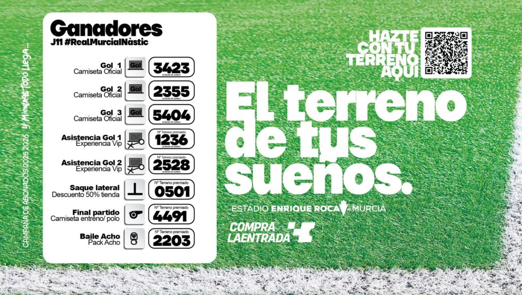 Los ganadores serán anunciados en la web y redes sociales del club tras la finalización de la jornada. El Real Murcia C.F. contactará con ellos a través de email antes del comienzo de la siguiente jornada a disputarse en el Estadio Enrique Roca de Murcia.