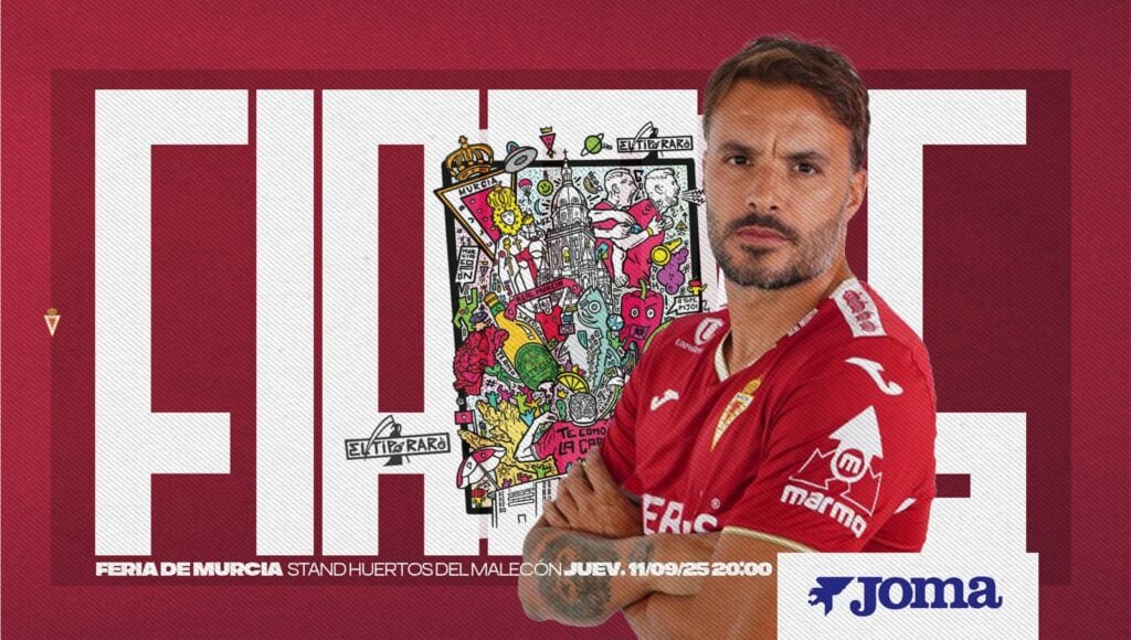 El Real Murcia C.F. anuncia una cita muy especial para mañana, jueves 11 de septiembre, en el marco de la Feria de Murcia. A partir de las 20:00 horas, en el stand oficial del club ubicado en los Huertos del Malecón, los murcianistas podrán disfrutar de una sesión de firmas con la participación de Pedro León, jugador del primer equipo, y El Tipo Raro, reconocido artista de la Región de Murcia y autor de la camiseta de la campaña de abonados 2025-2026.