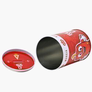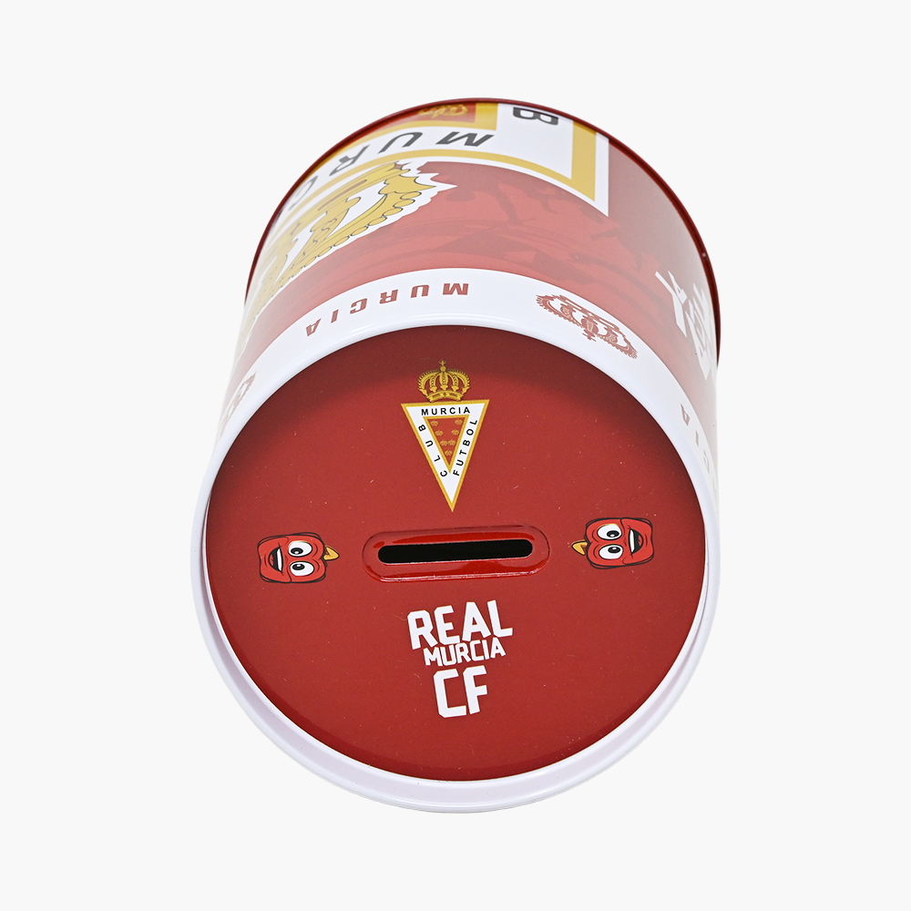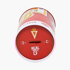 Hucha del Real Murcia CF fabricada en aluminio resistente, con diseño en color rojo que incluye el escudo del club, la inscripción “Real Murcia CF” y la imagen de Acho Pimentón, la mascota oficial.