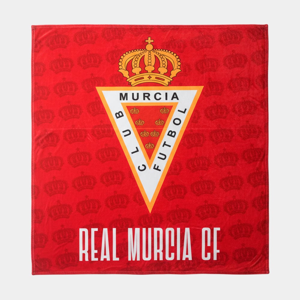 Manta grande y ultrasuave fabricada en microfibra de tacto polar. Color rojo grana con un patrón de coronas en todo el fondo. Diseño central con el Escudo del Real Murcia C.F. y el texto «REAL MURCIA CF» en la parte inferior. Ideal para el sofá, la cama o para abrigarse en el estadio.