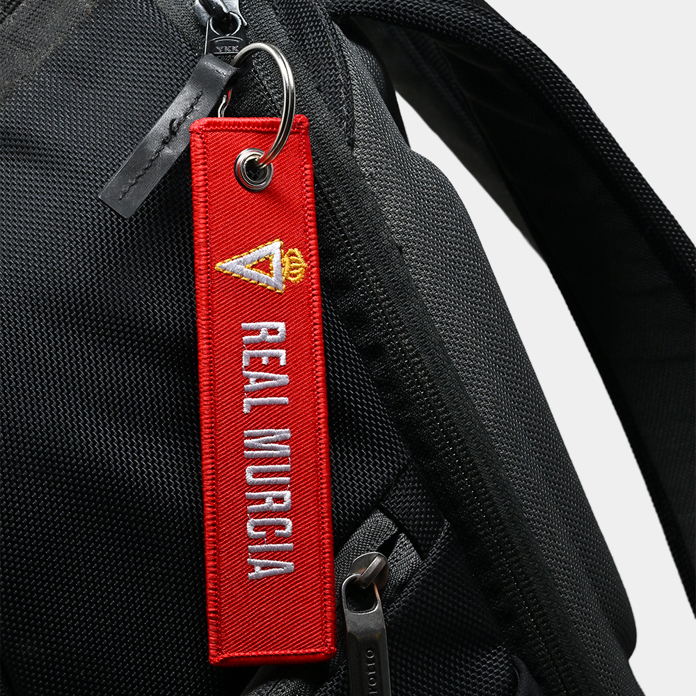 Tirador de cremallera o llavero rectangular fabricado en tejido textil resistente de color rojo grana. Presenta el texto “REAL MURCIA” y el escudo triangular del club bordados en hilo blanco y dorado. Incluye una anilla metálica resistente para usar como llavero o para acoplar a cremalleras de mochilas y bolsas.