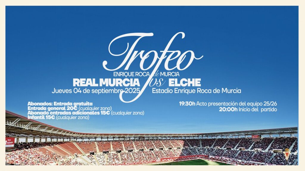 El próximo jueves 4 de septiembre, el estadio Enrique Roca de Murcia vivirá una cita muy especial para todos los murcianistas: la disputa del Trofeo Enrique Roca, que servirá como partido de presentación oficial del Real Murcia de cara a la temporada 2025/26.