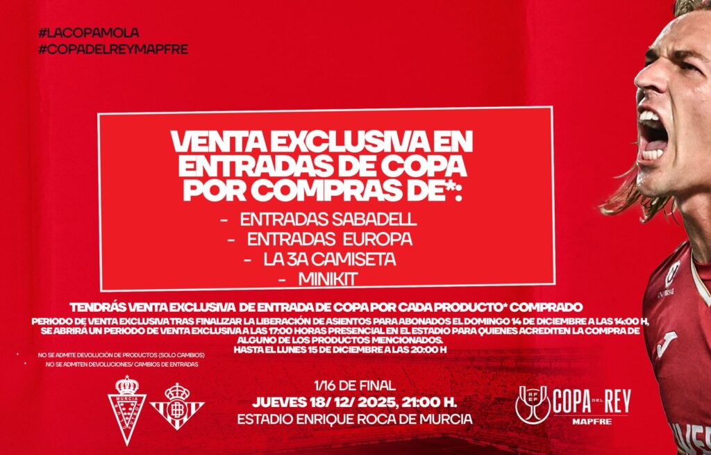 Los aficionados que deseen beneficiarse de esta promoción deberán acudir presencialmente a la Tienda Oficial del Estadio Enrique Roca de Murcia, donde deberán acreditar su compra (entrada, camiseta o minikit) o bien realizarla en el mismo momento junto con la adquisición de la entrada para la Copa del Rey.