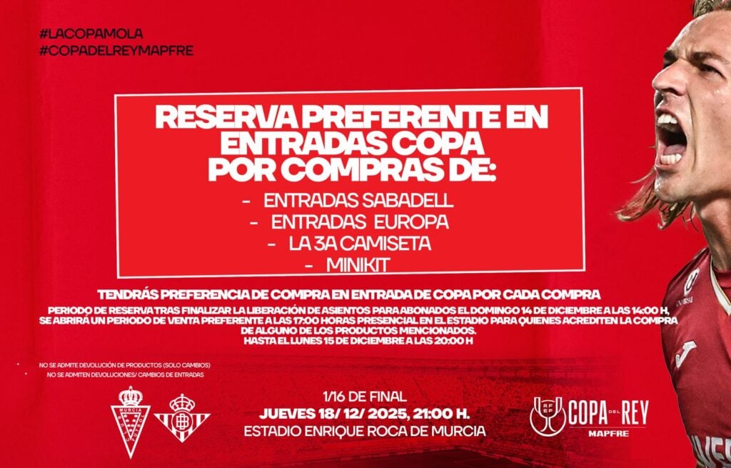 El Real Murcia C.F. anuncia una promoción especial de cara al encuentro de Copa del Rey frente al Real Betis Balompié. Todos aquellos aficionados que adquieran alguno de los siguientes productos podrán acceder a una venta preferente de entradas para el partido copero: