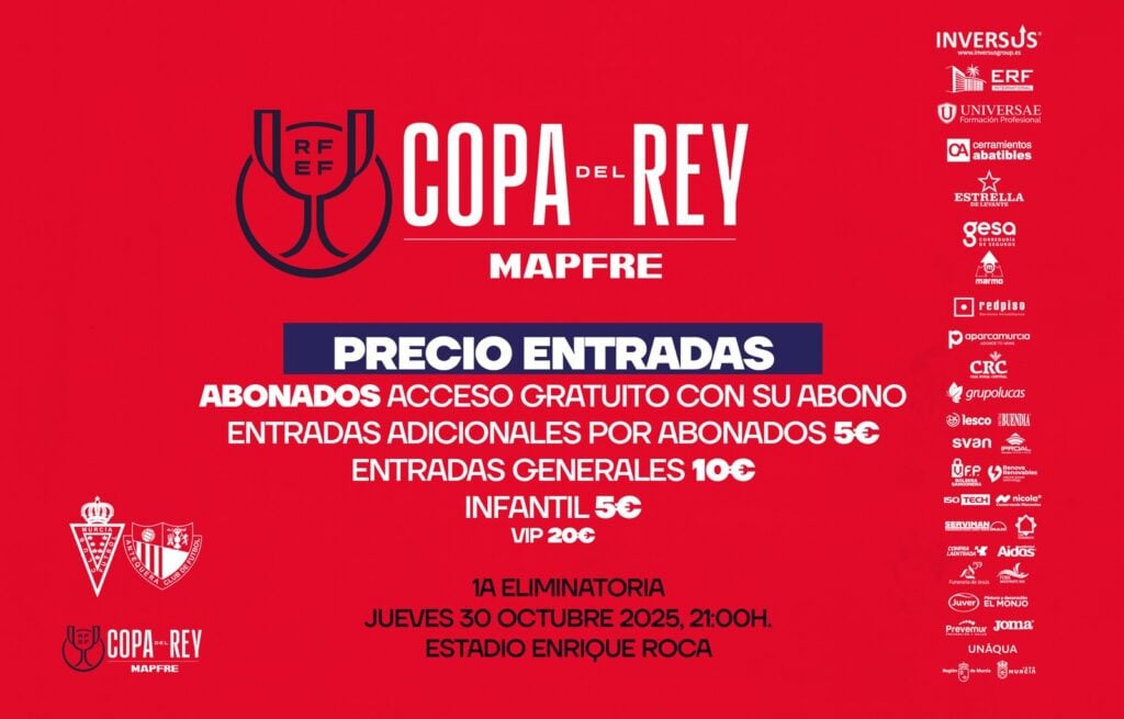 El Real Murcia ya ha puesto a la venta las entradas para el encuentro correspondiente a la primera eliminatoria de la Copa del Rey 2025-2026, que enfrentará a nuestro equipo ante el Antequera CF el jueves 30 de octubre a las 21:00 horas en el Estadio Enrique Roca de Murcia.